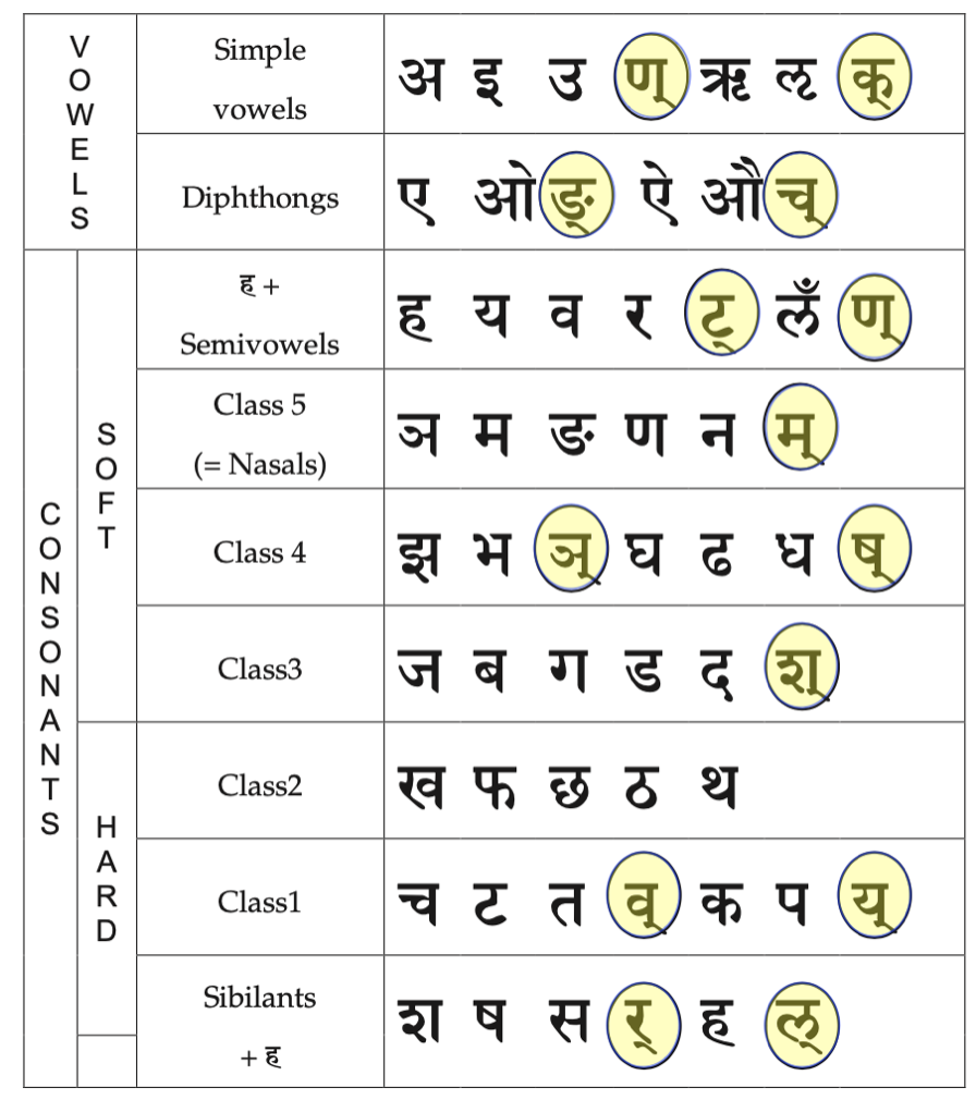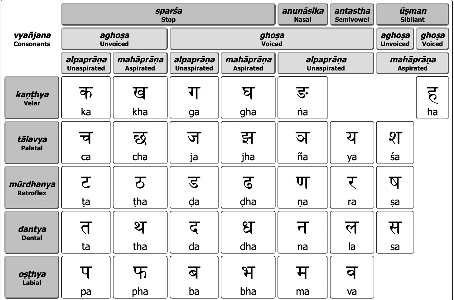 mūrdhanya | ट ṭa | ठ ṭha | ड ḍa | ढ ḍha | ण ṇa | र ra | ष ṣa | ऋ / ॠ ṛ / ṝ | |