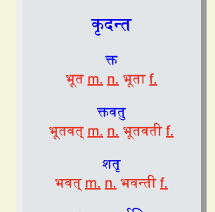 अस् in in 4 लकाराः to be - in लट, लङ् लोट् and लिङ् 63 | कृ in 4 लकाराः present लट् 51 Imperative 62 Potential 62 | Imperative लोट् Endings only 55 Potential Mood लिङ् |
